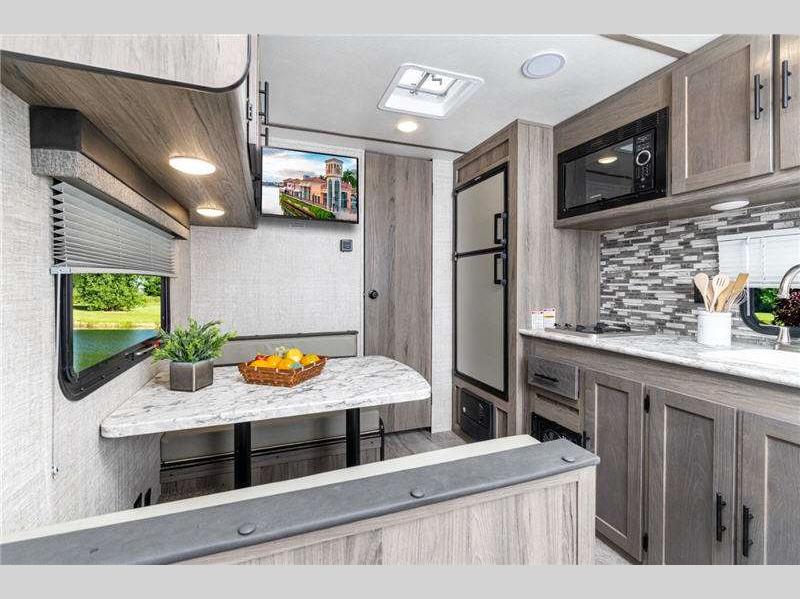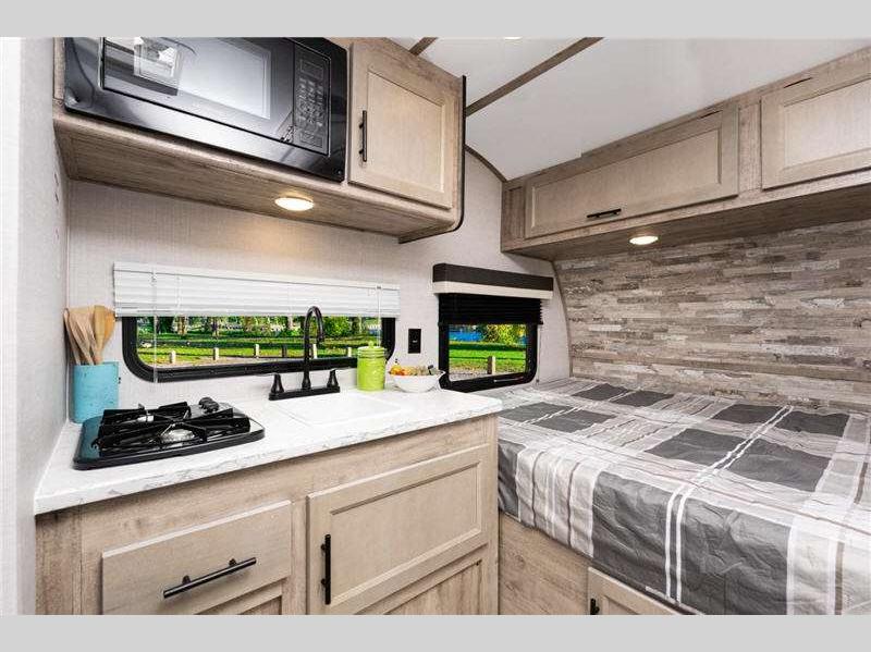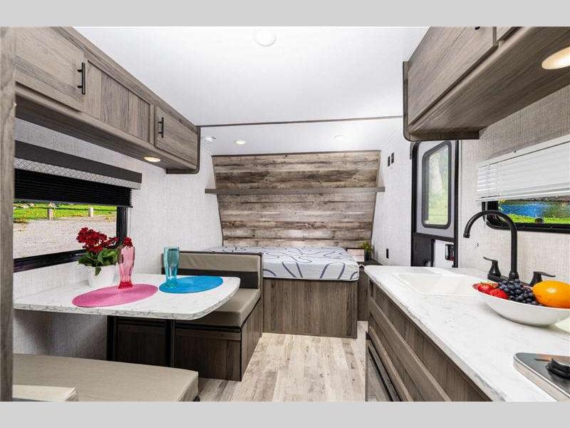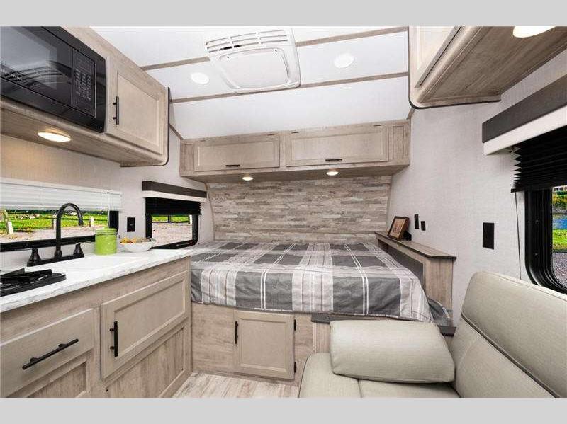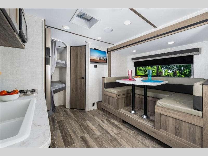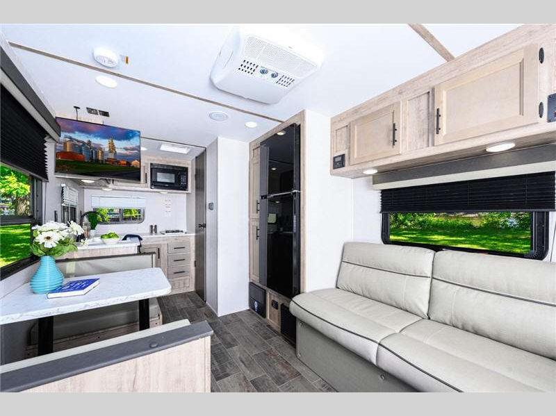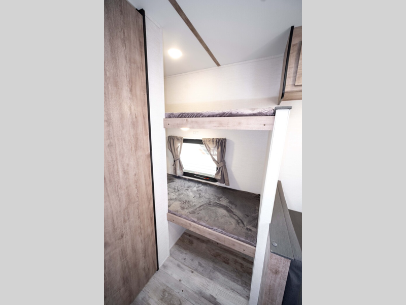 Sleeps 5 Length 20 ft 11 in Ext Width 8 ft Ext Height 10 ft 4 in Int Height 6 ft 8 in Hitch Weight 360 lbs Dry Weight 3100 lbs Cargo Capacity 760 lbs Fresh Water Capacity 23 gals Grey Water Capacity 36 gals Black Water Capacity 36 gals Furnace BTU 20000 btu Number Of Bunks 2 Available Beds Queen Refrigerator Type 12 Volt Refrigerator Size 10 cu ft Cooktop Burners 2 Number of Awnings 1 LP Tank Capacity 20 lbs Water Heater Type Tankless AC BTU 13500 btu Awning Info Power Axle Count 1 Number of LP Tanks 1 Shower Type Standard Electrical Service 30 amp Similar Floorplans