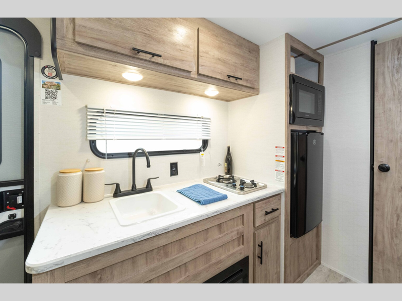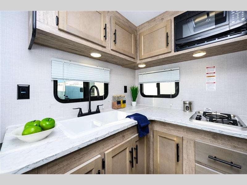 Sleeps 5 Length 20 ft 11 in Ext Width 8 ft Ext Height 10 ft 4 in Int Height 6 ft 8 in Hitch Weight 330 lbs Dry Weight 2810 lbs Cargo Capacity 1020 lbs Fresh Water Capacity 23 gals Grey Water Capacity 36 gals Black Water Capacity 36 gals Number Of Bunks 2 Cooktop Burners 2 Number of Awnings 1 LP Tank Capacity 20 lbs Water Heater Type Tankless AC BTU 13500 btu Awning Info Power Axle Count 1 Number of LP Tanks 1 Shower Type Standard Electrical Service 30 amp Similar Floorplans